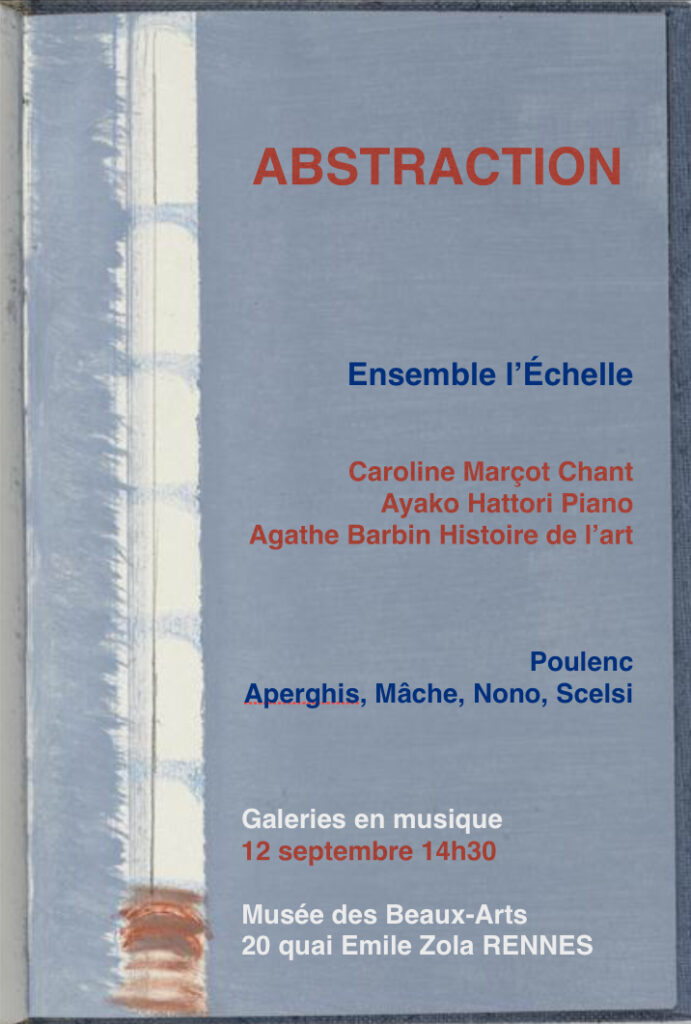 Paul Eluard et Francis Poulenc – poète et compositeur – furent passionnés d’art pictural toute leur vie durant. Leur correspondance, leur amitié, et leurs échanges donnent naissance entre 1924 et 1956 à un cycle de mélodies : le Travail du Peintre. Tous deux s’accordent à célébrer dans la peinture abstraite la rencontre du trait et de la lumière… La place du silence s’intensifie chez F.B Mâche ou Luigi Nono, comme peut apparître le « blanc » de la toile. Giascinto Scelsi s’intéresse à la polarité d’une seule note, tout comme Geneviève Hasse puise infiniment dans le bleu, et Pierre Soulages dans le noir, monochromes. Pour finir, Georges Aperghis joue avec les mots avec humour !